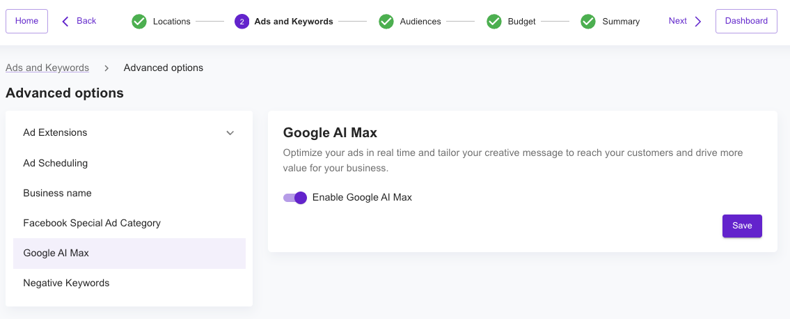- Enable the Google AI Max toggle to turn on the feature.