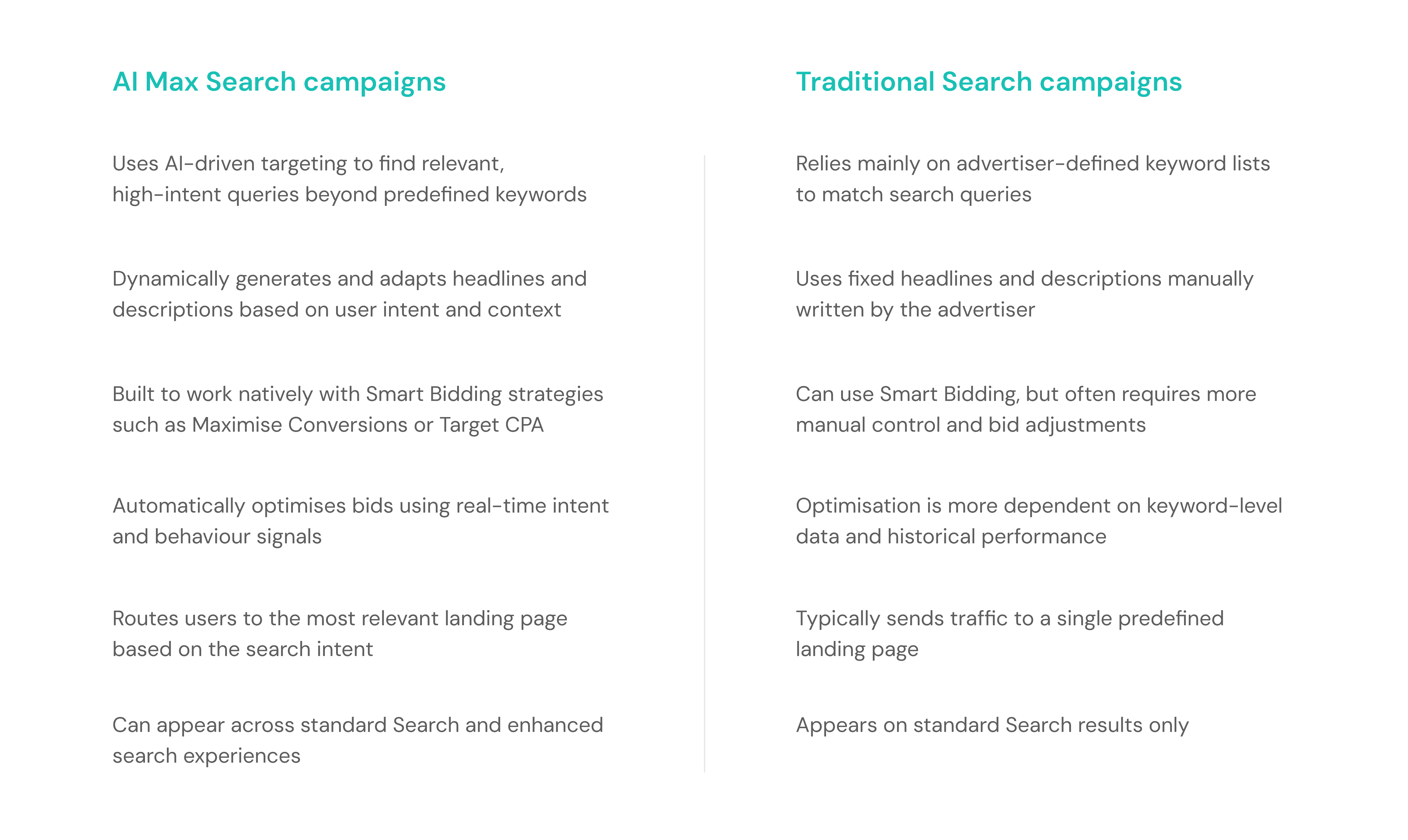 The key differences between AI Max Search campaigns and traditional Search campaigns are outlined below: